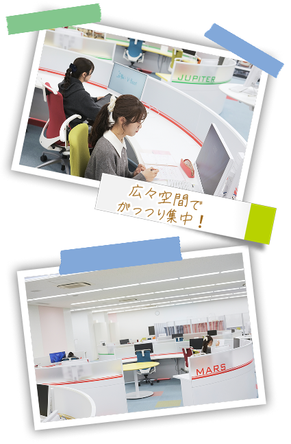 1号館1階の「サイバースペースコスモス」は、100台以上のPCを完備した自主学修に最適なスペースです。 広く確保されたPCブースで個人の作業に集中できるほか、インタラクティブボードを備えた「グループ室」では、画面を共有しながらの複数人のディスカッションも可能です。※ご利用の際は、受付にて申請が必要となります。