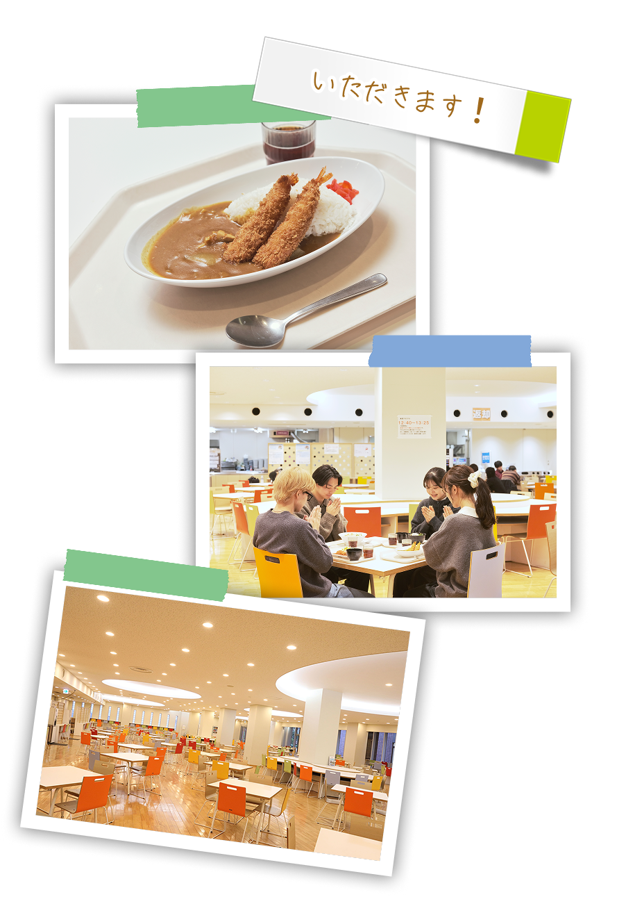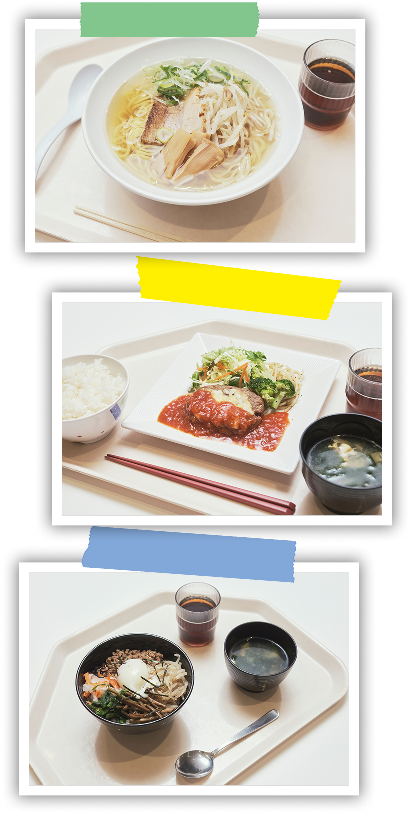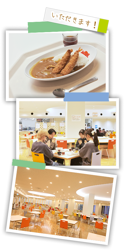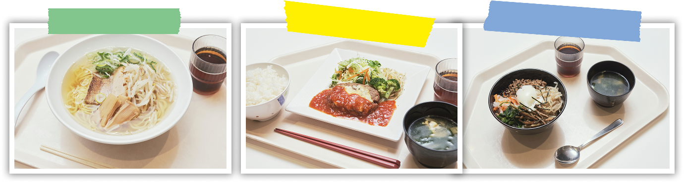 定食・カレー・丼・麺類(ラーメン・そば・うどん)など、バラエティ豊かなメニューが揃った食堂「アゼリア」。日替わりメニューもあるので、毎日足を運んでも飽きないのがうれしいポイント!