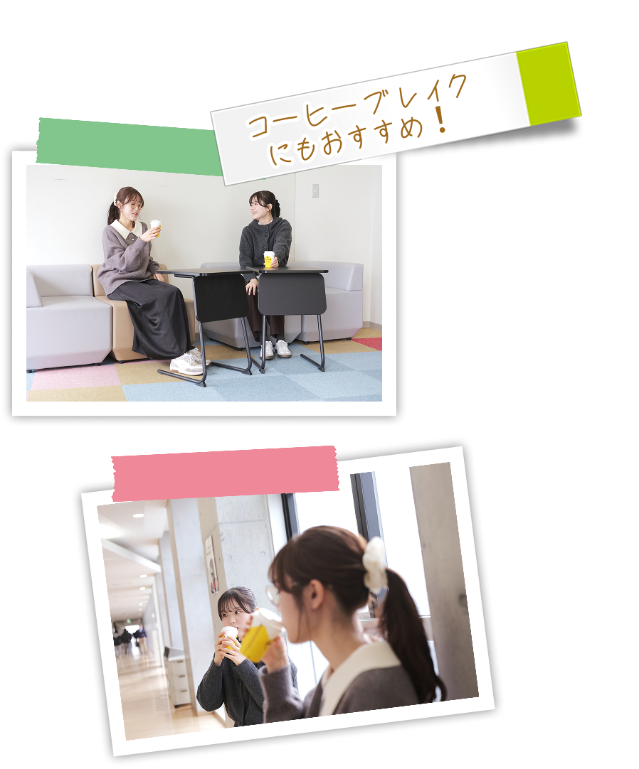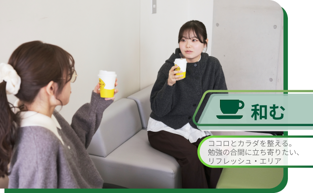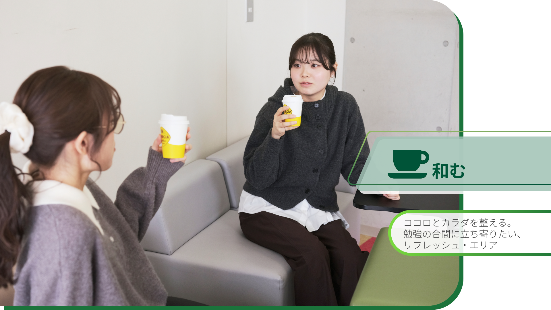 キャンパス内には、ランチにおやつ、空きコマの自習や友人との談笑など、自由に使えるフリースペースが点在しています。にぎやかな場所で過ごすのも楽しいけれど、時にはホッと一息つける場所も必要ですよね。