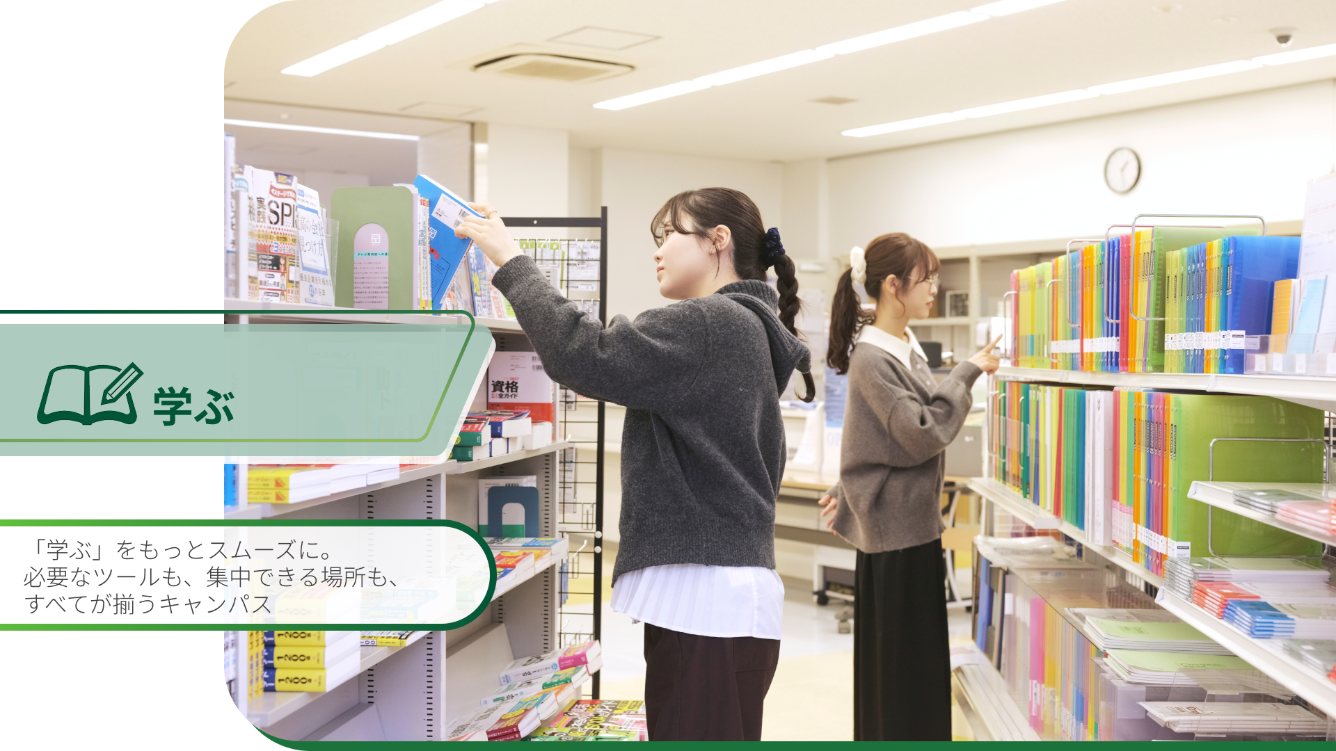 正門から2号館に入ってすぐの場所にある購買部には、教科書や文房具類がズラリ。授業で使う教科書はすべてここで購入できます。さらに、商学部の学生なら全商品10%OFFになる割引制度も!