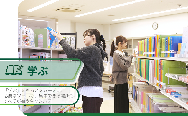 商学部のキャンパスには、学生生活の食や学びを支える施設や設備、