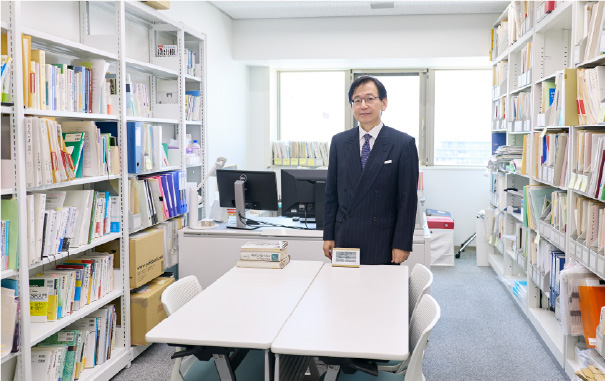 本棚には会計や環境に関する多様な専門書が並び、資料は用途ごとにフォルダ分けされている。知識の源泉を思わせる空間からは、村井先生の環境会計に対する高い志を感じられる。