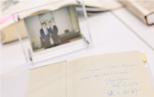35年前、初めて世界的に著名な会計学者である井尻雄士氏の講演会を聴きに行った際、記念に撮影した一枚。井尻先生に「会計学の夢(Dream of Accounting) 」と「憧れ」を感じ、研究者という「道」に進んだ自分自身の原点を振り返らせる写真。