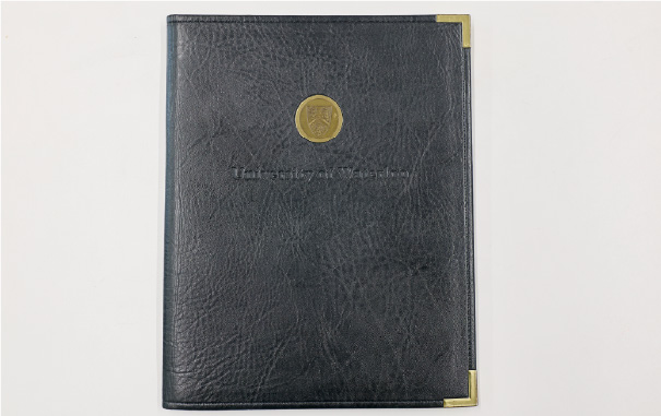 カナダのウォータールー大学に2年間留学していた際、大学の購買部で購入したファイル。現地で学びを深めた証として、今も大事に愛用している。使うたびに「日本という狭い国に閉じこもらず、世界にメッセージを発信しなければ」と気持ちが引き締まるアイテムなのだそう。