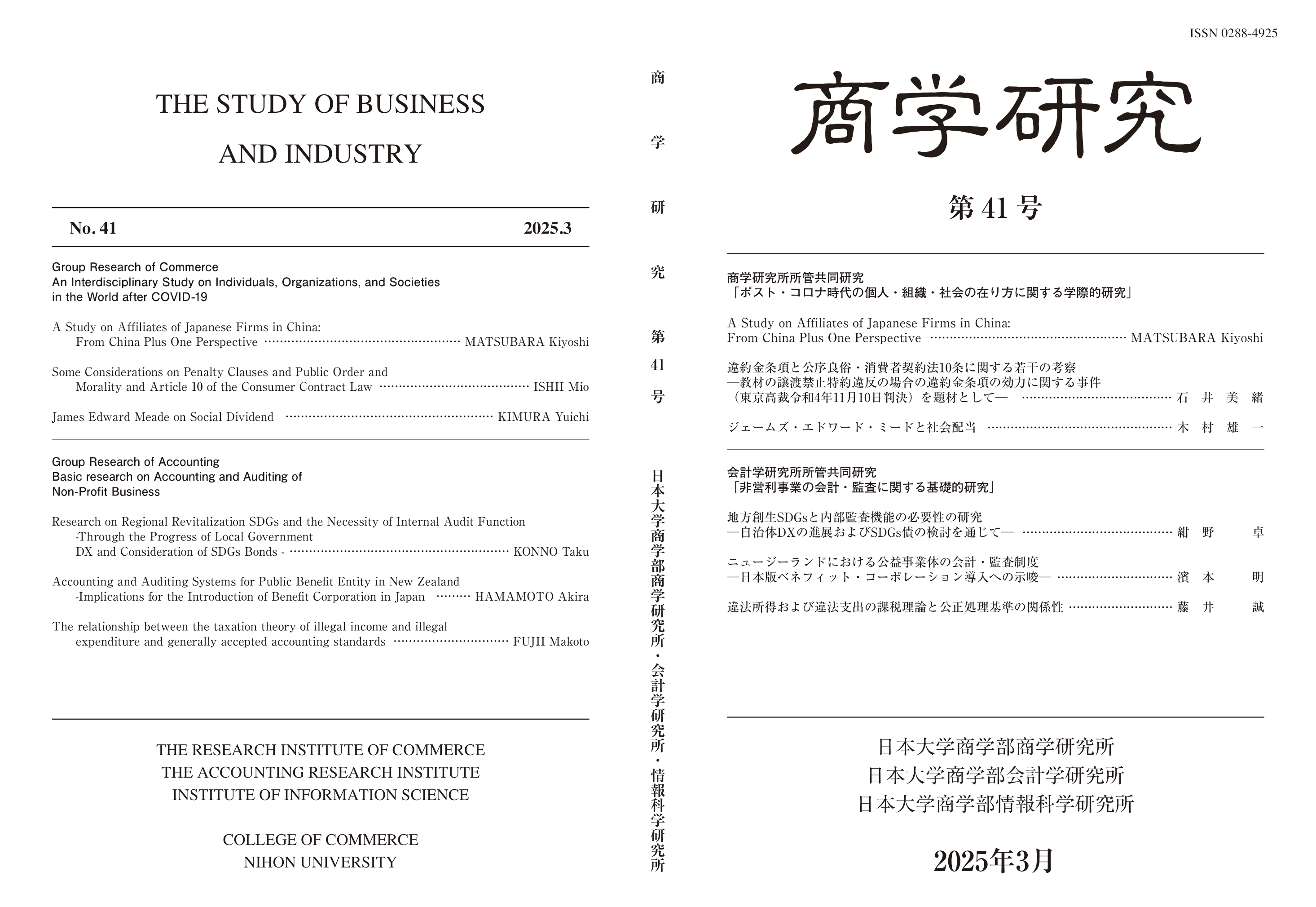 日本大学商学部では、大学における教育、研究の成果を公開し社会の発展に貢献することを目的として、教職員が発表した研究論文をまとめた紀要『商学集志』『総合文化研究』『商学研究』を発行・公開しています。