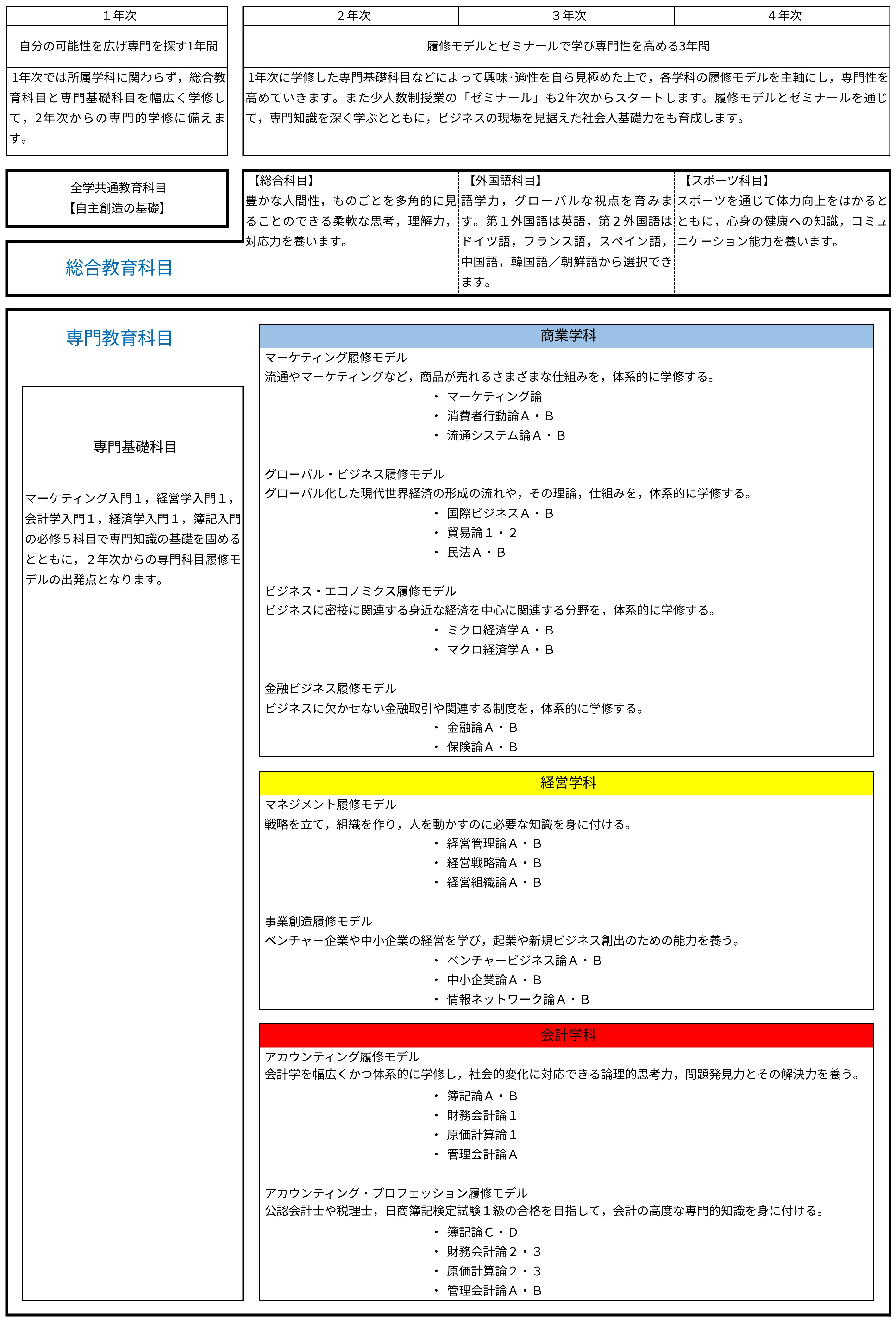 商学部での学びは、商学・経営学・会計学・経済学といった専門領域の知識習得をベースに、教養科目、多様な言語の学びを合わせることで、知識の総合化を図り、「あらゆるビジネス実践に適応できる知恵(総合知)」を養うものです。