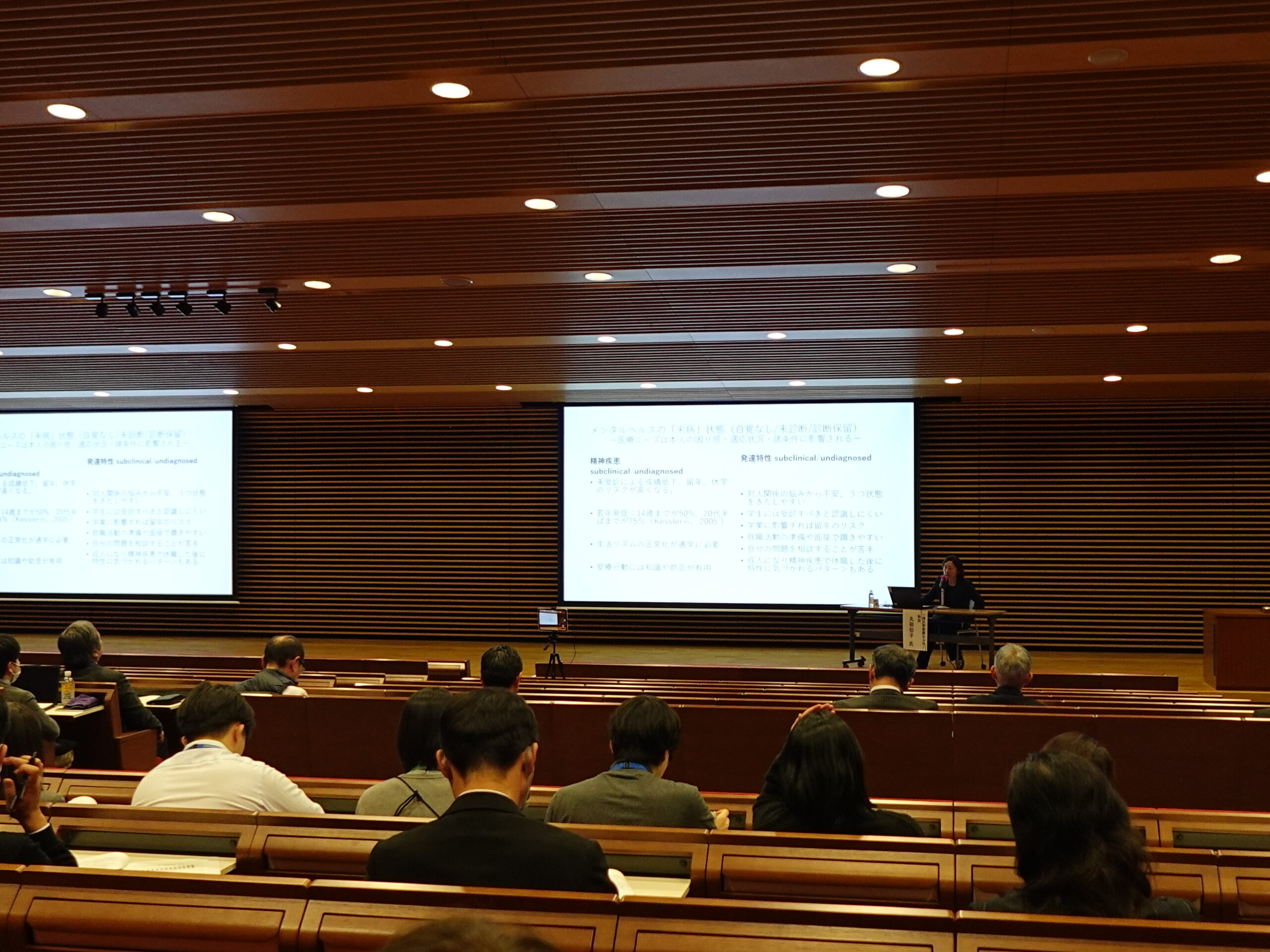 講演会では,メンタルヘルスケアの意義に始まり,精神障害・発達障害・両者の重複を有する学生の実態について基本的な数的情報等をご説明いただき,続いて,支援や対応内容,及び実践を通じて見える課題等についてお話しいただきました。
