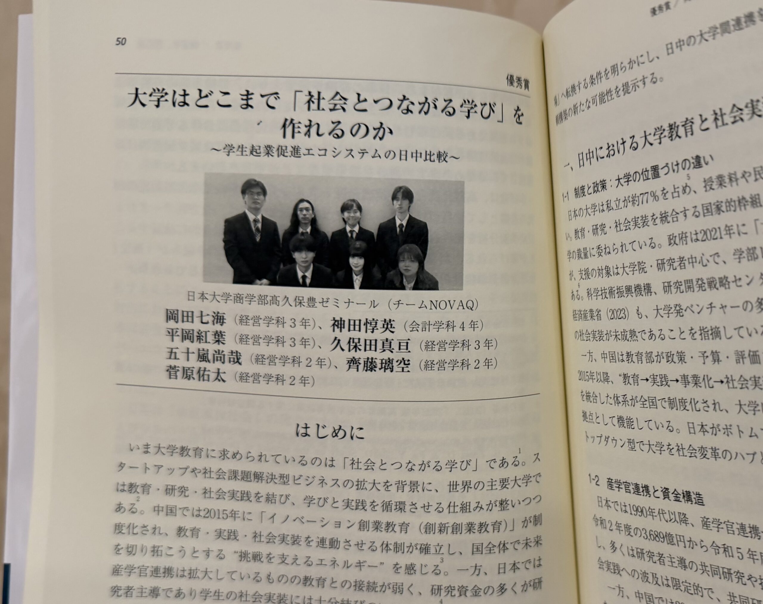 「大学はどこまで『社会とつながる学び』を作れるのか―学生起業促進エコシステムの日中比較―」と題するチームNOVAQの論文では,中国の大学において学生自らが社会問題への解決策やビジネスを構想する実践的教育が進展していることや,中国型を踏まえた「日本型循環モデル」の方向性などが提示されました。この論文は,受賞作品集『分断時代の架け橋―日中AI協力が拓く新たな可能性』(日中関係学会編,2026年)のなかに掲載されています。